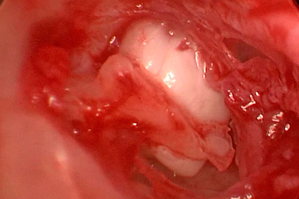 Mittelohrbefund bei einer Second Look Operation: Cholesteatomperle am Hammergriff.