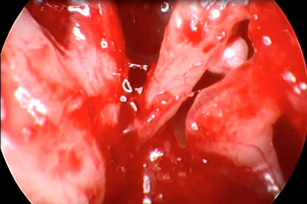 Eröffnetes Mittelohr bei einem angeborenen Cholesteatom im Mittelohr eines Kindes.
